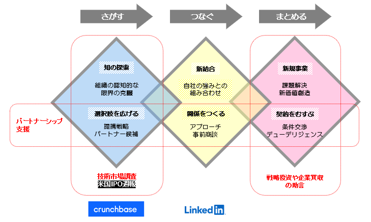 TransCapは、新規事業開発を加速するパートナーシップの各ステップ(「さがす」「つなぐ」「まとめる」)において、クライアントの状況やニーズに応じて適切なアドバイスとサポートを提供します。
